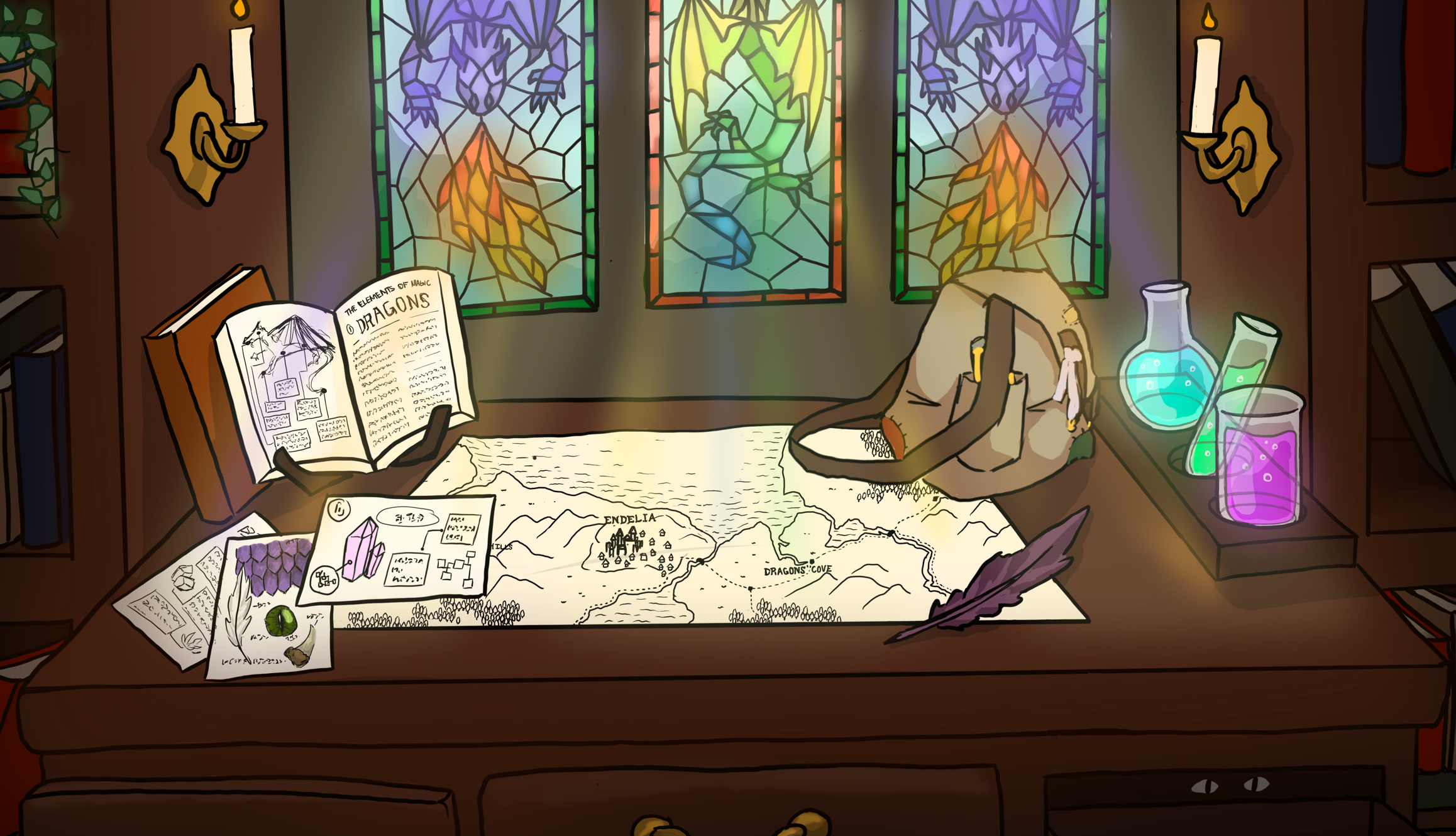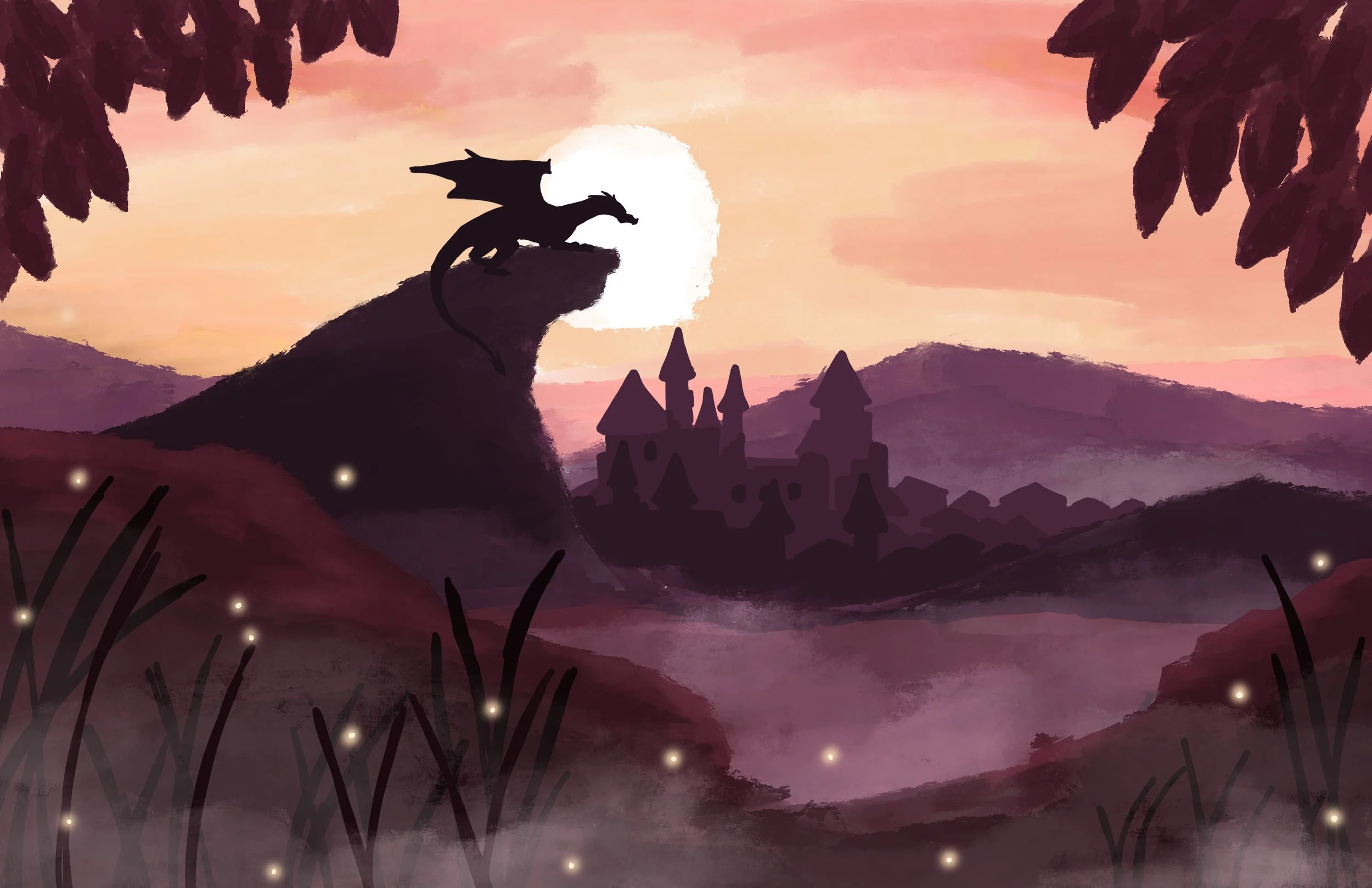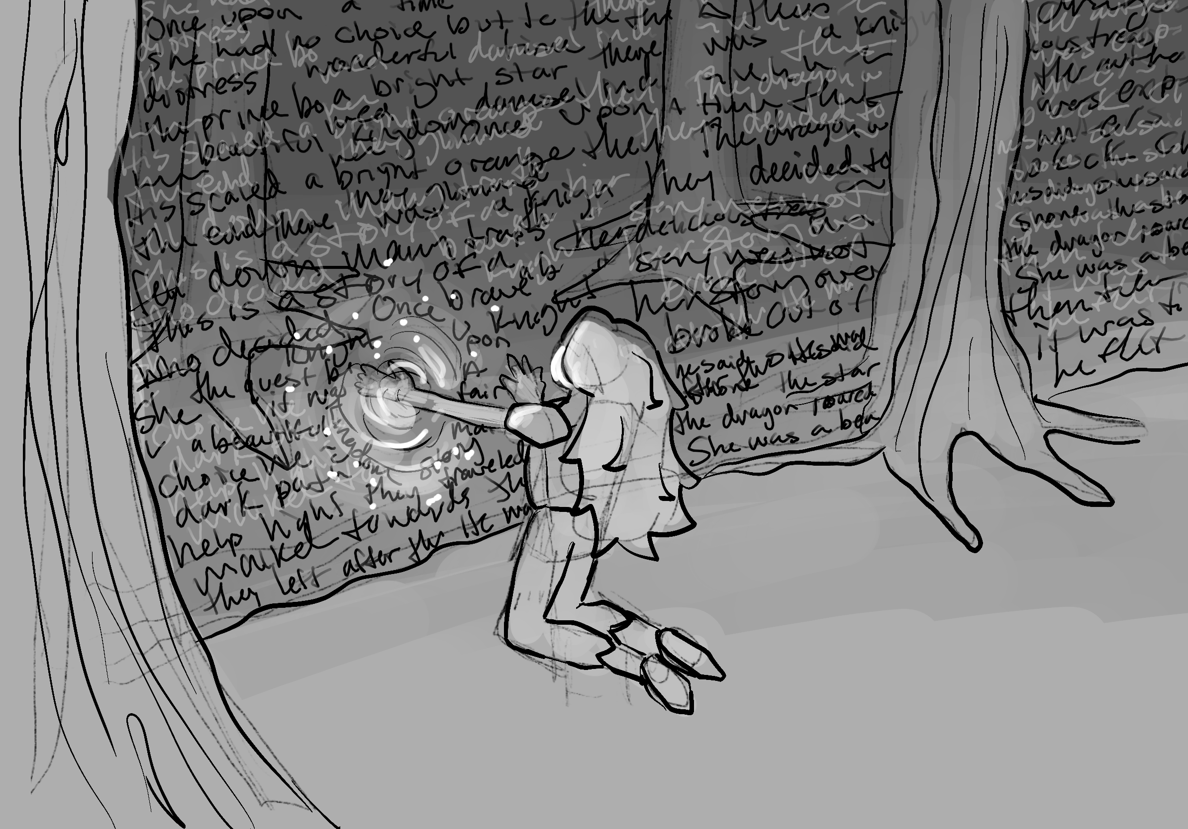 Concept art for a magical kingdom called Endelia where the main character confronts the author of her story.